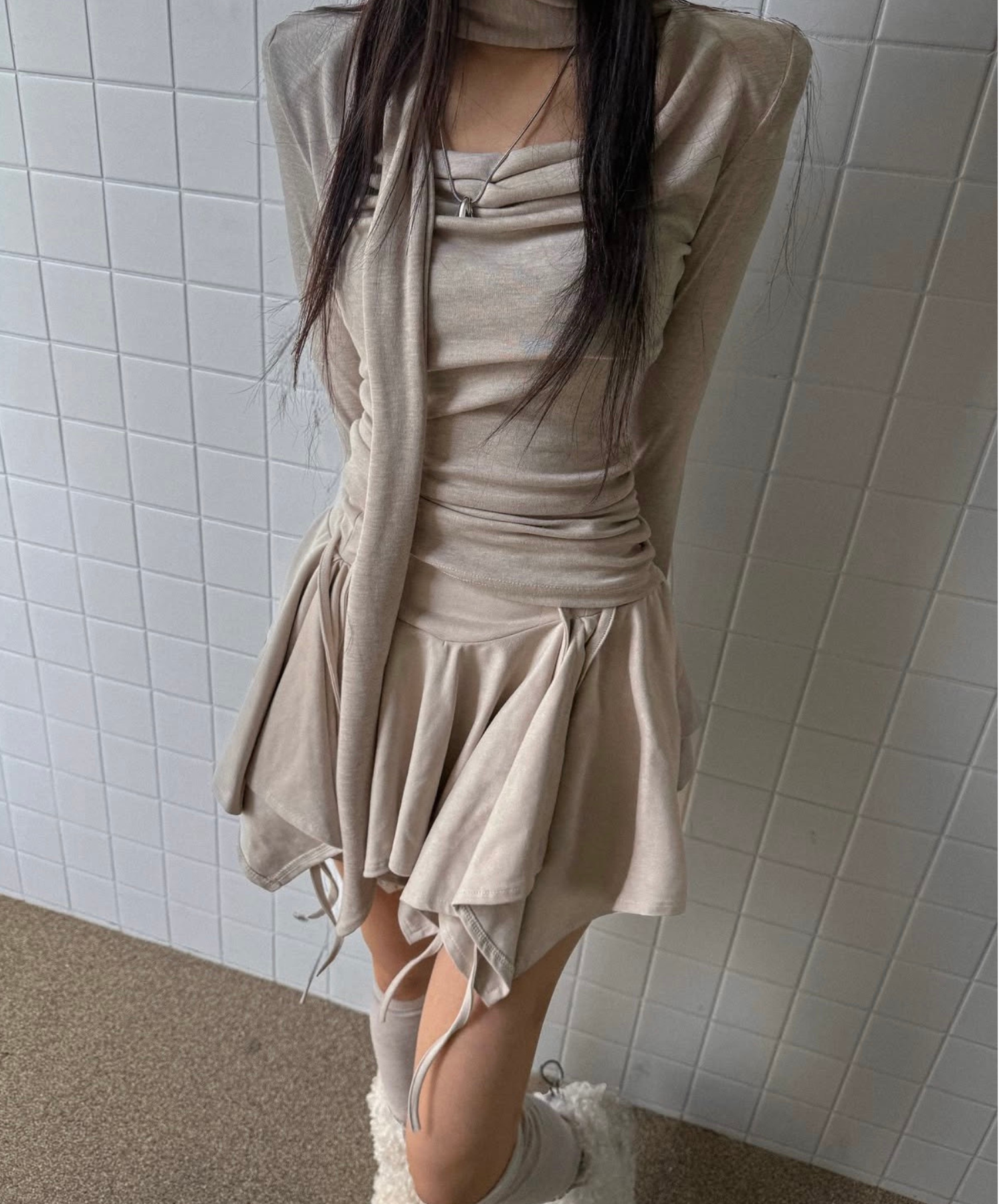 身体に程よくフィットするシルエットで、女性らしいラインを美しく引き立てます。